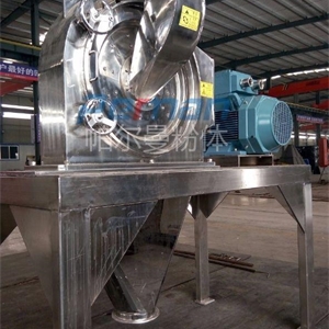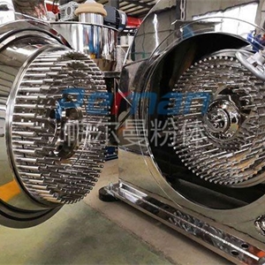 3、磨盤式:物料從進料管進入由靜盤和動磨盤組成的粉碎腔,由于動盤的高速旋轉(zhuǎn)和風機的作用下,使物料不斷被剪切、撞擊、摩擦,顆粒越來越小,并向外移動,最后經(jīng)過出料管由集料系統(tǒng)收集。