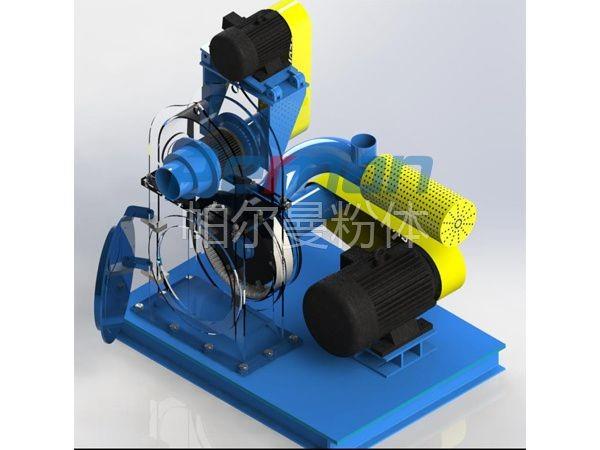 兩級(jí)沖擊超微研磨機(jī),包括一級(jí)研磨機(jī),研磨機(jī)上部設(shè)置研磨通道,研磨通道上部安裝有分級(jí)機(jī),通過(guò)法蘭盤連接,分級(jí)機(jī)上設(shè)置有用于將研磨的物料吸入分級(jí)機(jī)內(nèi)的風(fēng)機(jī),分級(jí)機(jī)的下部設(shè)置有連通研磨通道的分級(jí)通道。二級(jí)研磨機(jī),下部增加襯板,內(nèi)部增加粉碎盤,一側(cè)可設(shè)立獨(dú)立的門口,方便查驗(yàn)。將二級(jí)研磨機(jī)置于分級(jí)機(jī)下方,一級(jí)研磨完成的物料隨著氣流進(jìn)入二級(jí)研磨機(jī)經(jīng)過(guò)二次研磨錘頭的沖擊,兩次沖擊后的物料進(jìn)入分級(jí)機(jī)進(jìn)行分選,合格細(xì)度的物料穿過(guò)分級(jí)輪進(jìn)入收集系統(tǒng),不合格的返回二級(jí)研磨區(qū)進(jìn)行再次研磨。為防止腔體經(jīng)過(guò)二級(jí)研磨后溫度升高,可在腔體外壁增加水循環(huán),不會(huì)破壞物料性質(zhì)。增加二級(jí)研磨機(jī)后,針對(duì)不同的物料,比傳統(tǒng)磨機(jī)提高30-60%的產(chǎn)能和細(xì)度,從而大大降低能耗。如此反復(fù),使物料粉碎的更加精細(xì),同時(shí)也不會(huì)出現(xiàn)存料的問(wèn)題,提高物料的利用率。