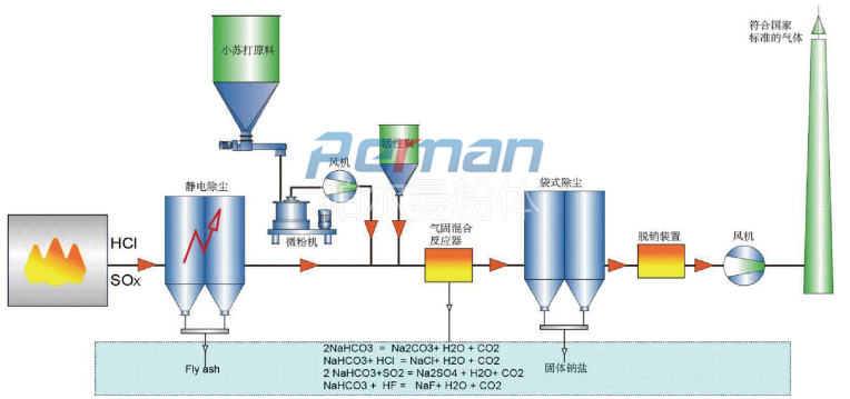 煙氣中含有大量的酸性氣體,經(jīng)過大量的數(shù)據(jù)和實(shí)驗(yàn),只有碳酸氫鈉(小蘇打, NaHCO3)小到一定的程度,其才能和煙氣中的酸性成分產(chǎn)生最大效率的反應(yīng)。它通過化學(xué)吸附去除煙氣中的酸性污染物,同時(shí)還可通過物理吸附去除一些無機(jī)和有機(jī)微量物質(zhì)。此工藝將碳酸氫鈉細(xì)粉直接噴入高溫?zé)煔狻T诟邷叵绿妓釟溻c分解生成碳酸鈉Na2CO3、H2O和CO2。