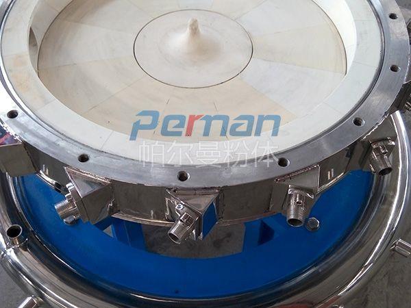 MQP圓盤氣流粉碎機設備是一種經壓縮空氣進行冷凍、過濾在干燥之后利用噴嘴的作用形成的超音速氣流準確的射入到粉碎室內,在氣流的作用下就能夠使物料呈現出流態化狀態,并且被進行加速運動處理加速后的物料會在多個噴嘴的噴射氣流的交匯點處進行匯合。物料匯合后就會因為高速氣流的作用而相互碰撞然后摩擦不斷的進行粉碎作用,循環處理之后就會達到超微超細粉碎的作用。